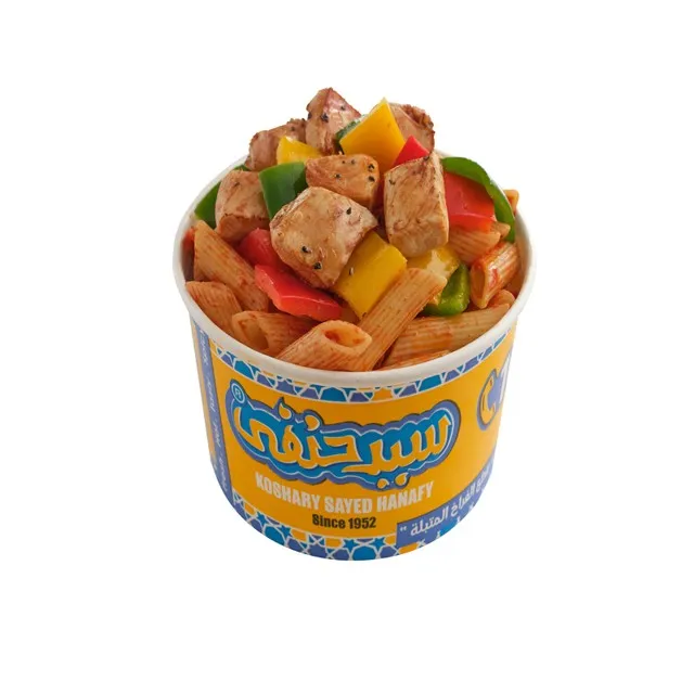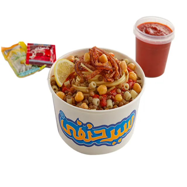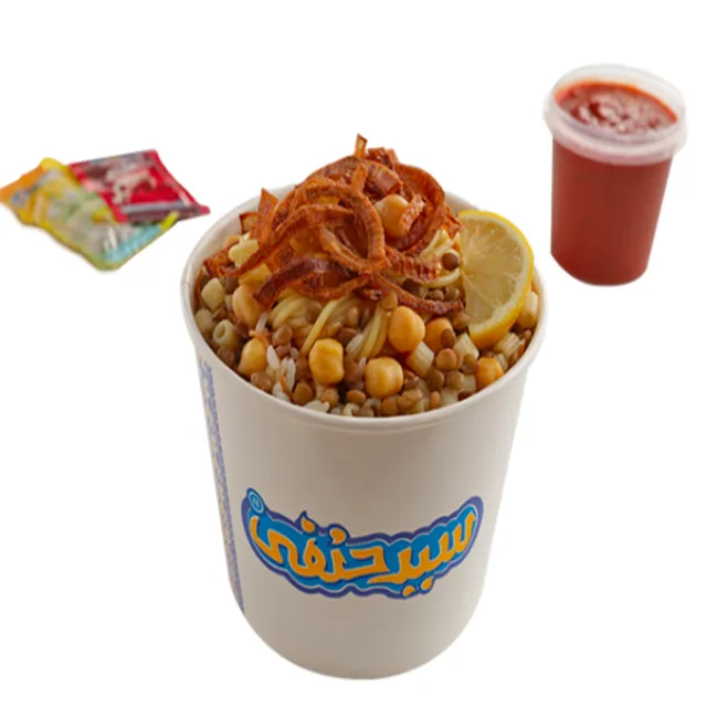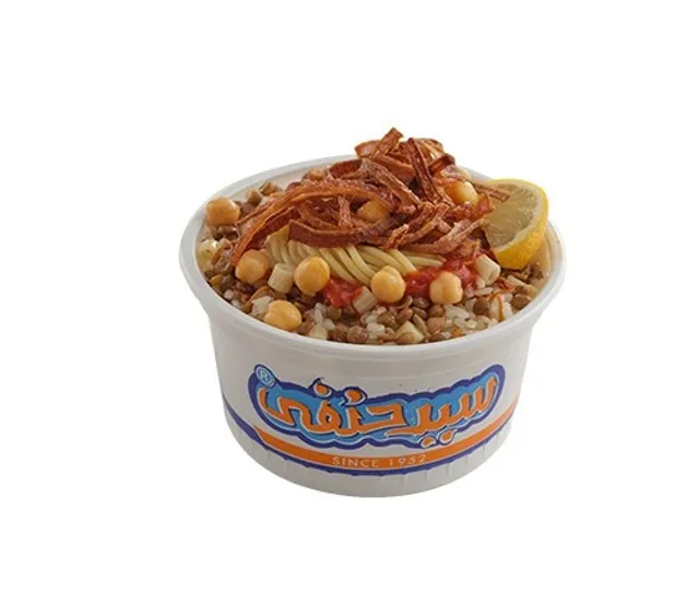 كشرى سيد حنفى المميز حجم كبير فى علبة كارتون حرارى قابلة لدخول الميكروف ( مكرونة اسباجنتتى و مكرونة مقصوصة مع الارز بالعدس بخلطة سيد حنفى المميزة و العدس و الحمص والتقلية) يقدم مع صلصة ودقة وشطة حارا جدا